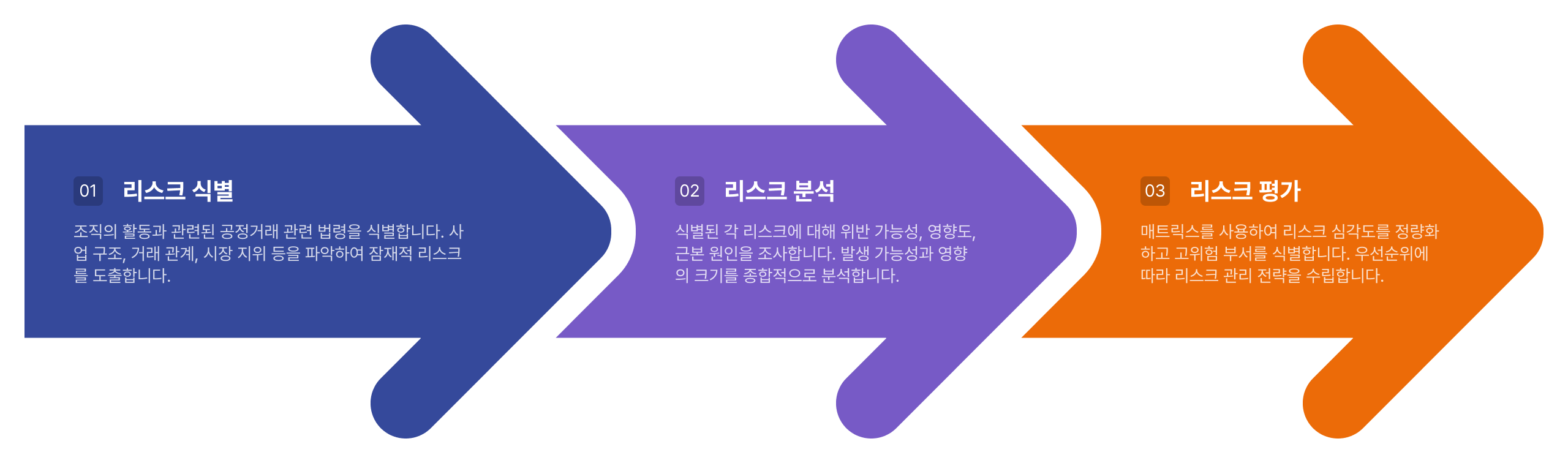 조직의 활동과 관련된 공정거래 관련 법령을 식별합니다. 사업 구조, 거래 관계, 시장 지위 등을 파악하여 잠재적 리스크를 도출합니다.