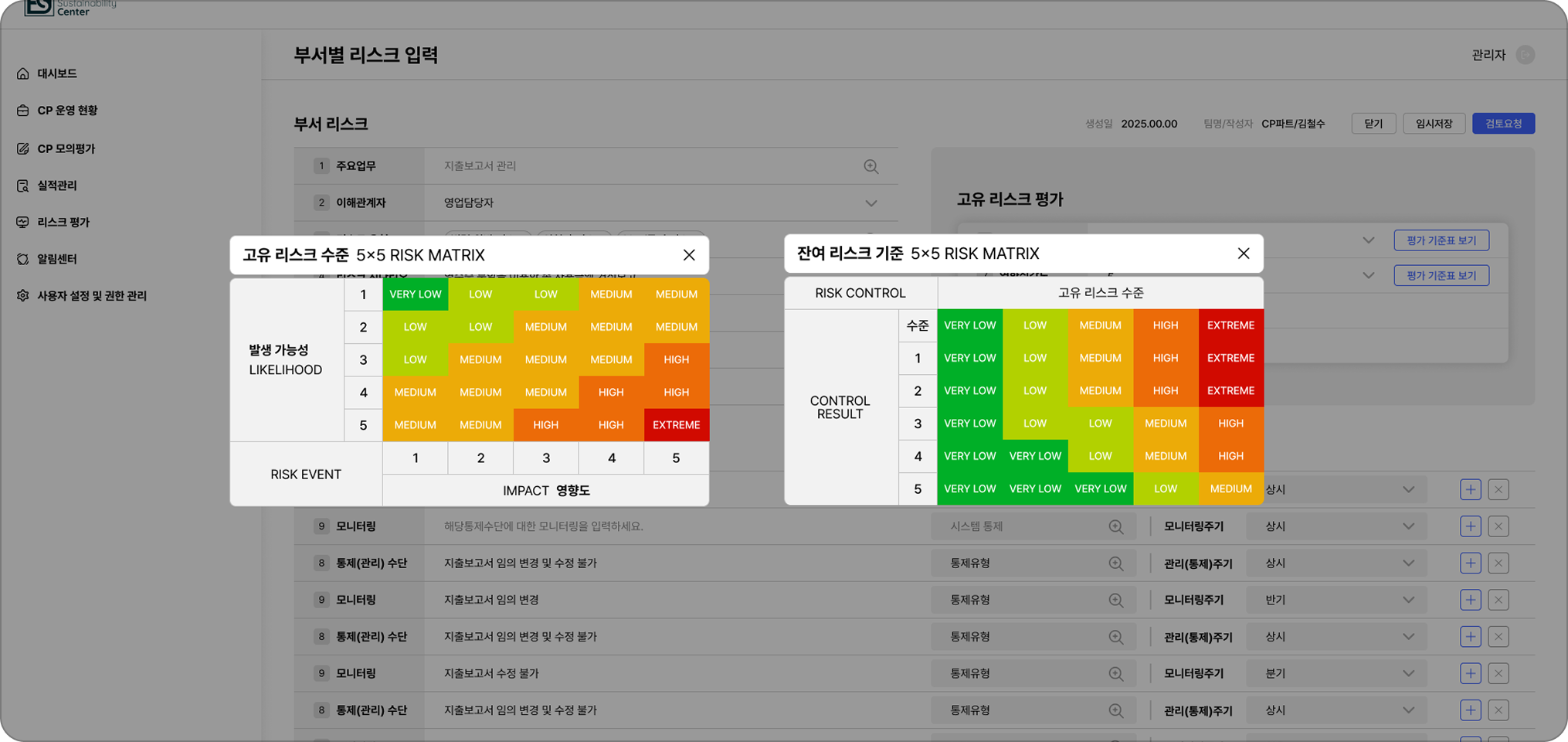 매트릭스를 사용하여 리스크 심각도를 정량화하고 고위험 부서를 식별합니다. 우선순위에 따라 리스크 관리 전략을 수립합니다.